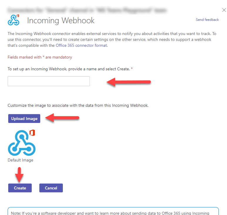 It will open up a new window providing you options to fill desired name and image for “Incoming webhook”, check all the details and fill in as per your selection and upload image if you want something else other than “default image” and hit “Create”.