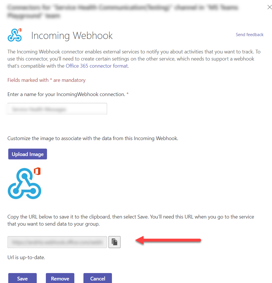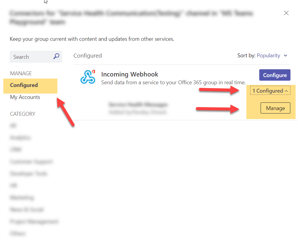 - Under Incoming Webhook, hit Configured already highlighted in above screenshot, and select Manage, from here, already configured connector URL can be copied.