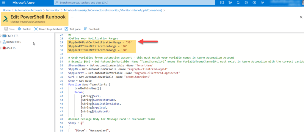 # Example $Uri = Get-AutomationVariable -Name "TeamsChannelUri" means the VariableTeamsChannelUri must exist in Azure Automation with the correct variable.