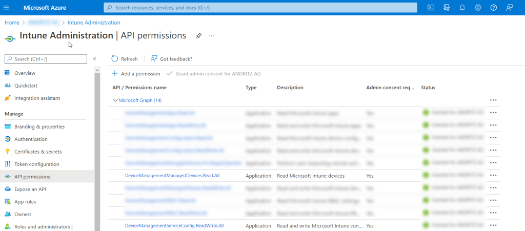 As mentioned above we have registered an App with Azure named Intune Administration and has assigned below Application permissions over Microsoft Graph API