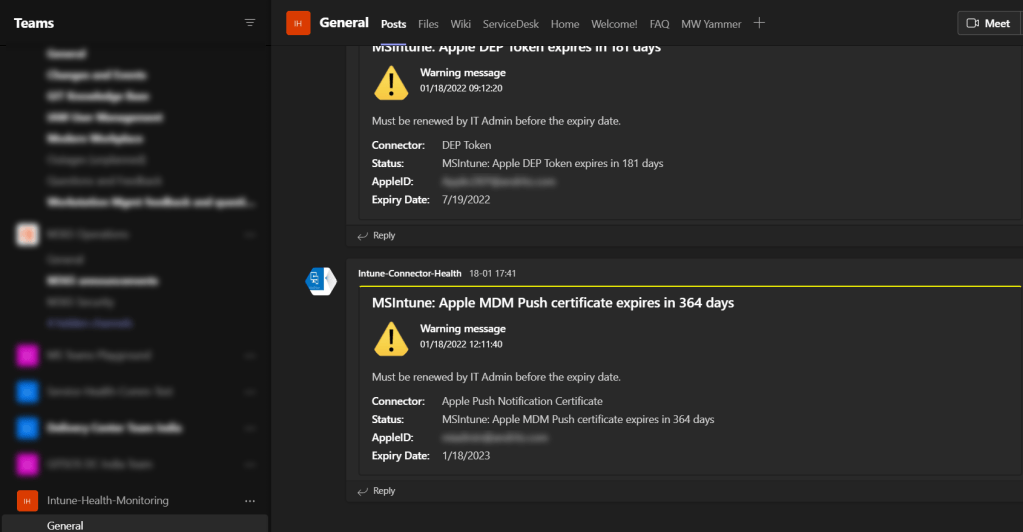Send-TeamsAlerts -uri $uri -ConnectorName "DEP Token" -ExpirationStatus $AppleDEPExpirationStatus -AppleId $AppleDEPId -ExpDateStr $DEPExpDateStr